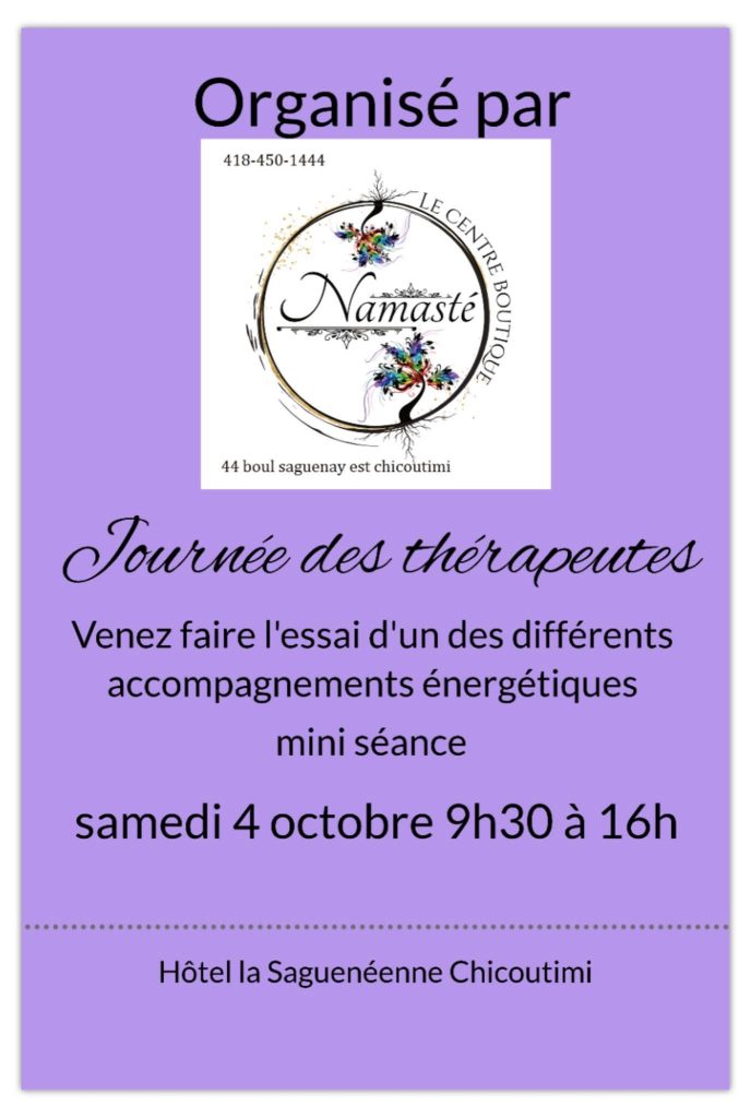 Vous êtes invités à venir nous rencontrer à la 1ere édition de la « Journée des thérapeutes » qui se tiendra à la Saguenéenne le samedi 4 octobre prochain !